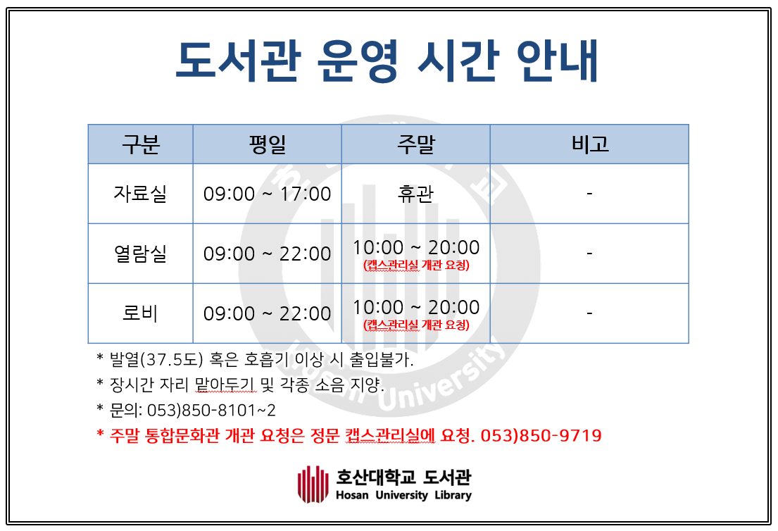 | ▶ Notice | 2026학년도 도서관 운영시간 안내 2026학년도 도서관 운영시간 안내 | 관리자 | 2024-08-26 | 18073 |