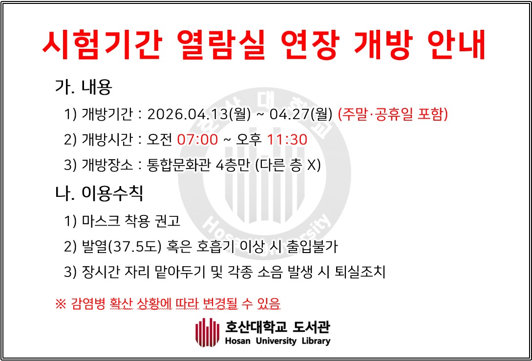 | ▶ 541 | 2026학년도 1학기 중간고사 기간 중 열람실 연장 개방 안내 | 관리자 | 2026-04-09 | 9 |