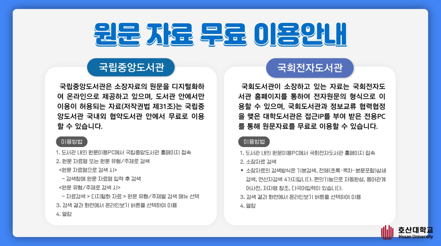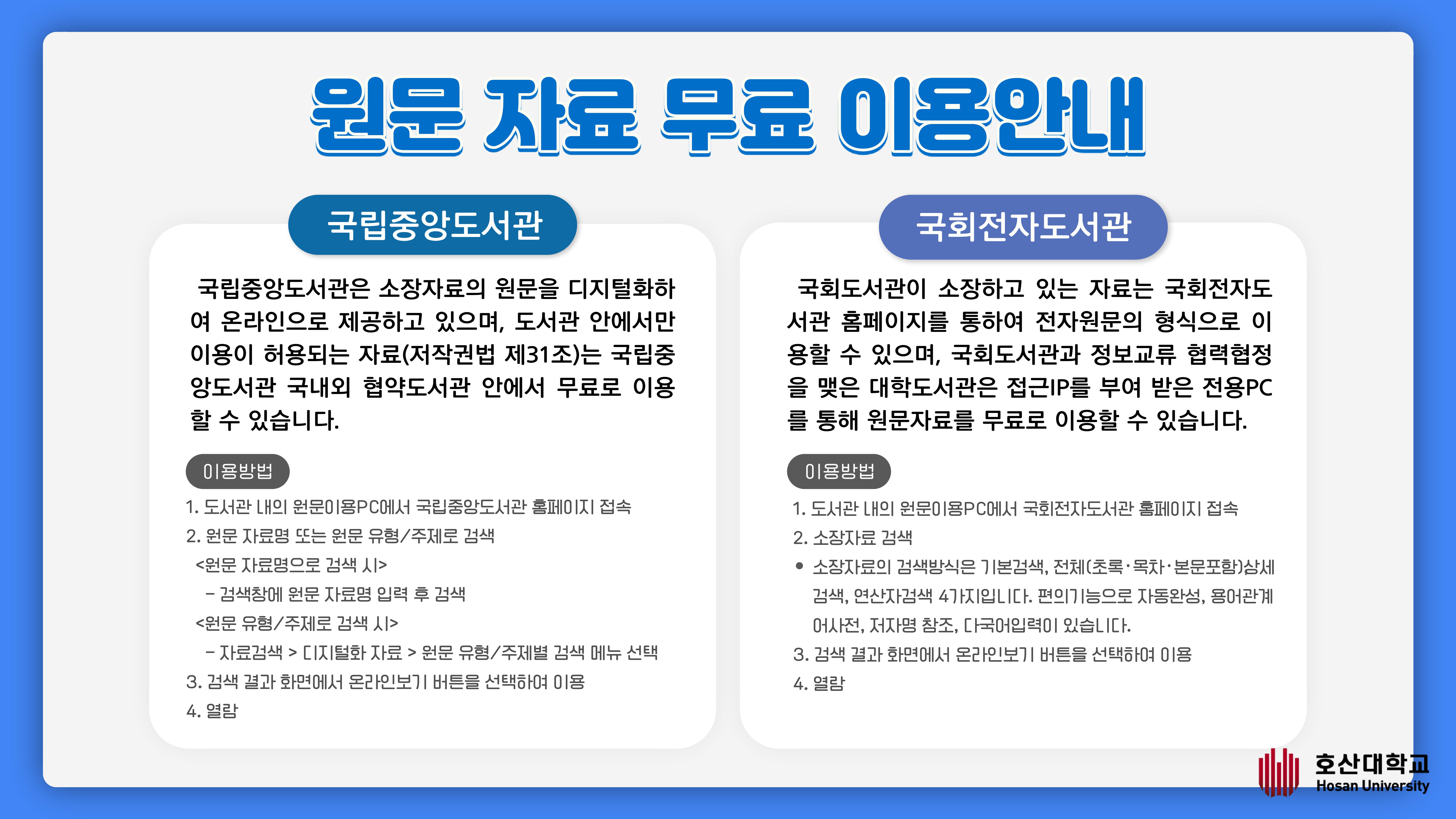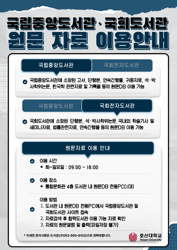 호산대학교 도서관은 이용자에게 다양한 학술정보 제공을 위해 국립중앙도서관 및 국회전자도서관과의 학술정보 상호협력 협정을 체결하여 각 도서관에서 소장하고 있는 원문(Full-text)자료의 열람 및 출력이 가능합니다.
