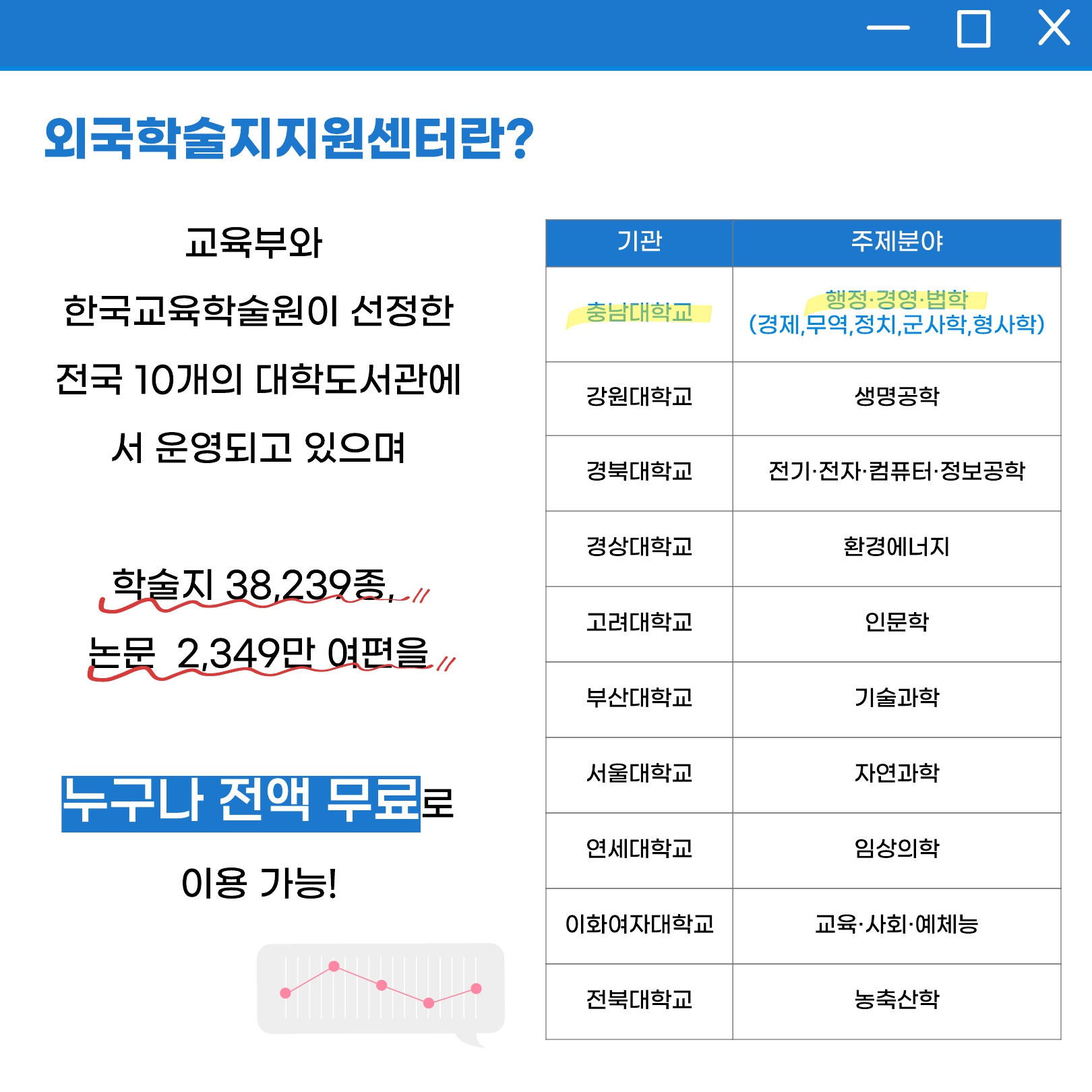 충남대학교 외국학술지지원센터의 서비스 학술지 목록 및 구독목록, 신규 구독 추천서는 하단의 첨부파일을 확인해주시기바랍니다.