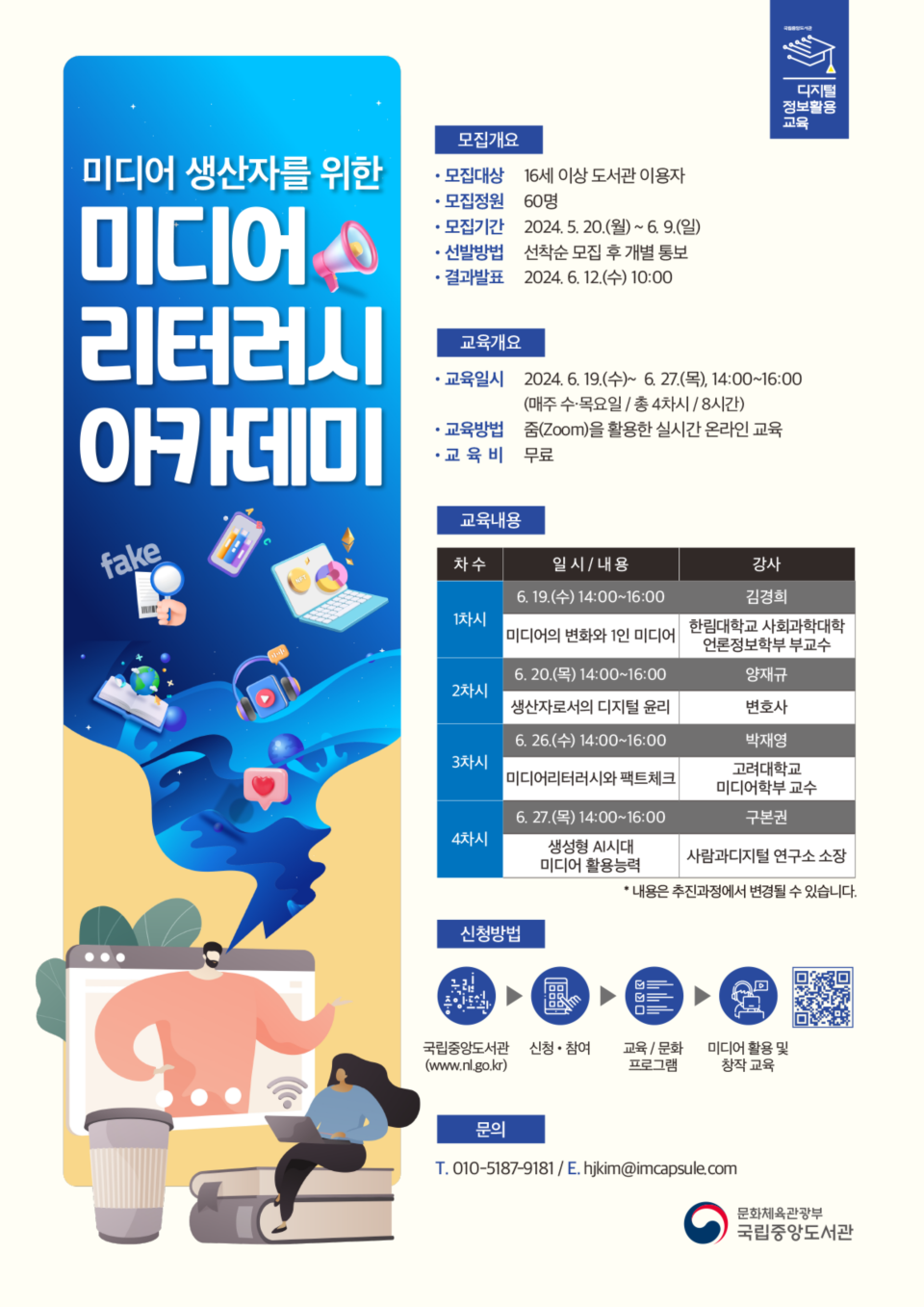 국립중앙도서관과 한국언론진흥재단에서는 미디어 생태계에 대한 이해, 신뢰도 높은 미디어 창작 방법 등의 교육을 위한 ‘미디어 생산자를 위한 미디어 리터러시 아카데미’를 운영합니다. 관심 있는 분들의 많은 참여를 바랍니다.